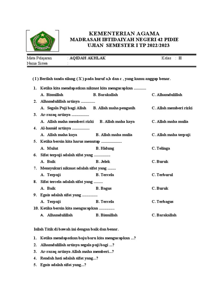 Berikut adalah contoh soal yang dirancang untuk menguji pemahaman siswa tentang materi Akidah Akhlak semester 1, dengan mengacu pada tema-tema yang umum diajarkan: